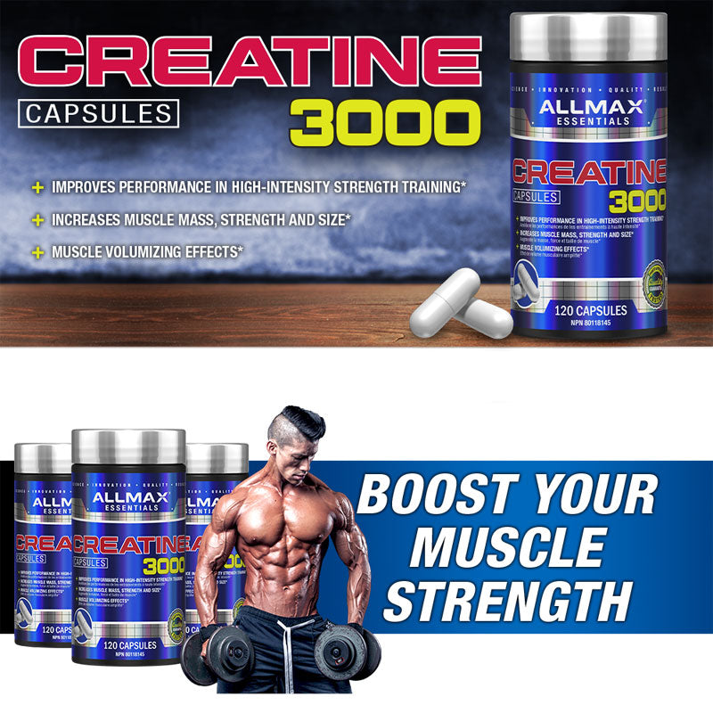 Allmax Creatine 3000 Monohydrate Capsules are the ultimate in purity and safety; rigorously held to strict standards that meet or exceed 3rd-Party independent testing and cGMP guidelines.