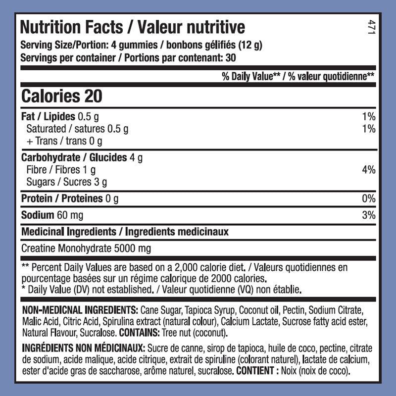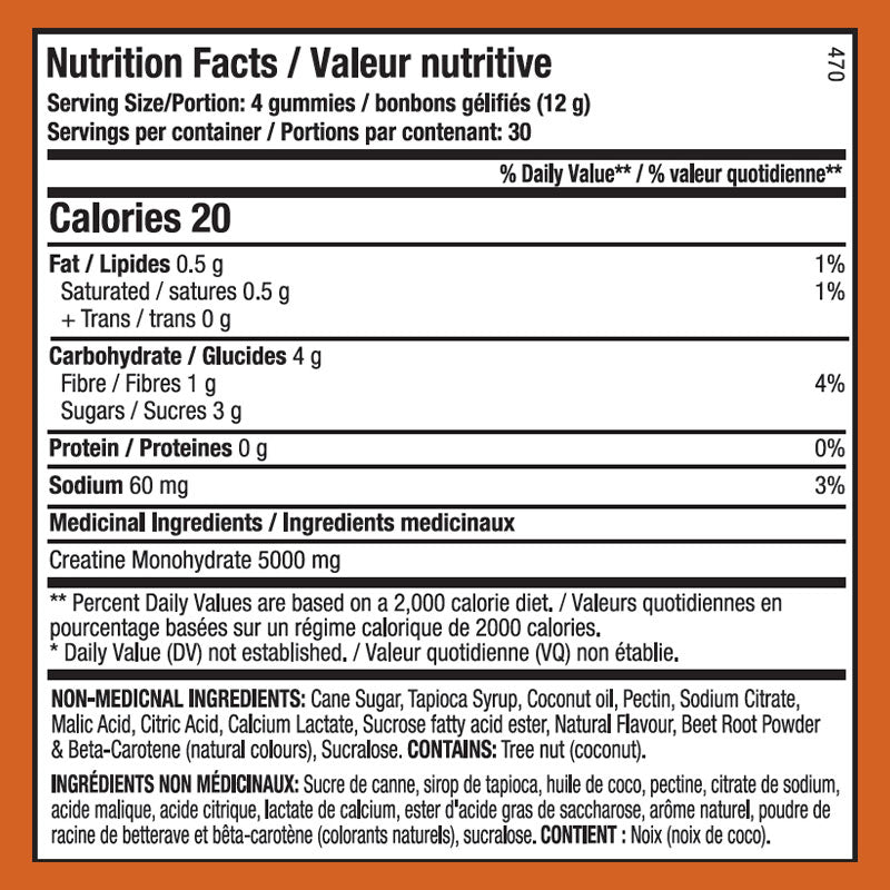 - 5g of creatine monohydrate per 4 gummy serving