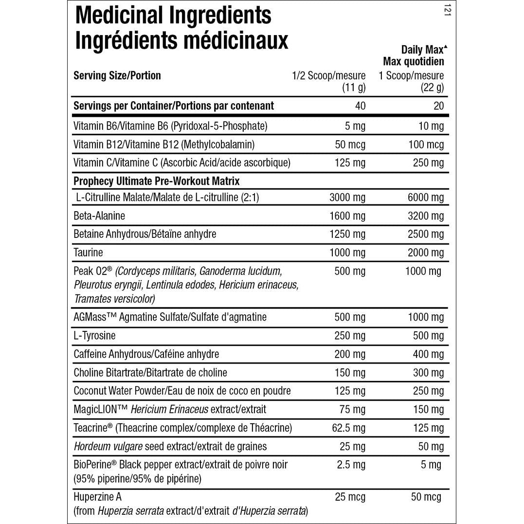 DIRECTIONS: Mix 1 scoop (20g) of PROPHECY™ with 8 to 16 oz of cold water and consume 15-30 minutes before training. To assess tolerance, begin with 1/2 scoop (10 g) mixed in 4 to 8 oz. of water. Read entire product label and warnings prior to using.