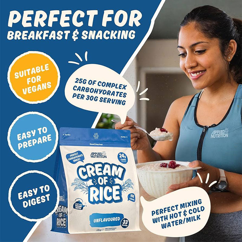 Applied Nutrition’s Cream of Rice is a great source of carbohydrates which is easy on the stomach and tasty too.