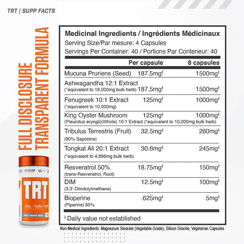 TRT is designed to take throughout the day. Take 4 capsules with your breakfast and the other 4 capsules preferably 30 minutes prior to training, or at night on non-training days.