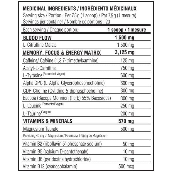 The Acetyl-L-Carnitine will help increase dopamine, which increases focus and motivation. The L-Tyrosine will also help with dopamine, as well as adrenaline and noradrenaline production. The CDP-Choline will boost cognition, Bacopa Monnieri may improve brain function, and Caffeine acts as a great proven stimulant.