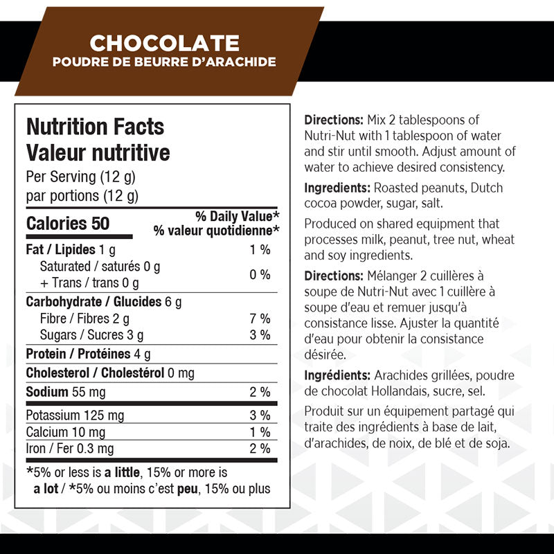 With 5g of protein, not only is Nutri-Nut is a delicious and nutritious way to add protein to a snack or meal it is also gluten free, non GMO and contains no artificial flavors, preservatives or sweeteners. Our Chocolate flavoured Nutri-Nut is a blend of powdered peanut butter and rich Dutch cocoa. It doesn’t get much more delicious than the combination of peanut butter and chocolate.