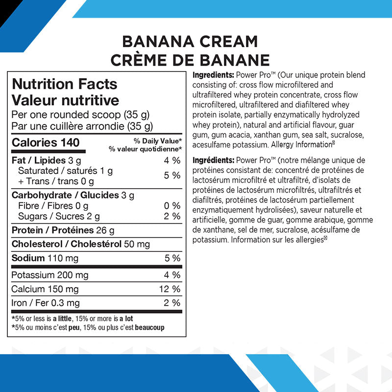Power Pro™ (Our unique protein blend consisting of: cross flow microfiltered and ultrafiltered whey protein concentrate, cross flow microfiltered, ultrafiltered and diafiltered whey protein isolate, partially enzymatically hydrolyzed whey protein), Dutch cocoa powder, fructose, natural flavour, Powerzyme™ (Proprietary protein and carbohydrate digestive enzyme complex consisting of: Aminogen* , bromelain and lactase), xanthan food gum, sucralose, carrageenan, salt.
