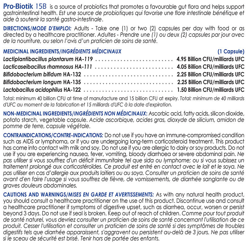 CanPrev’s Pro-Biotik™ 15B is a shelf-stable probiotic capsule formula containing five critical probiotic species naturally found in the human intestinal tract, including bifidobacteria and lactobacilli. Each species is represented at optimal levels to enhance the natural gut flora and provide a health benefit. Pro-Biotik™ 15B is completely shelf stable for ease of use anytime, anywhere – no refrigeration is required. At the time of manufacture, CanPrev’s Pro-Biotik™ 15B contains forty billion CFU’s (colony forming units – a measure of friendly bacteria activity). By the time it reaches its expiry date it is still guaranteed to have an activity level of 15 billion CFU’s – now that’s impressive! Keep a bottle of Probiotik 15B in your bag, knowing with confidence that you have a probiotic that works for you, wherever life takes you.
