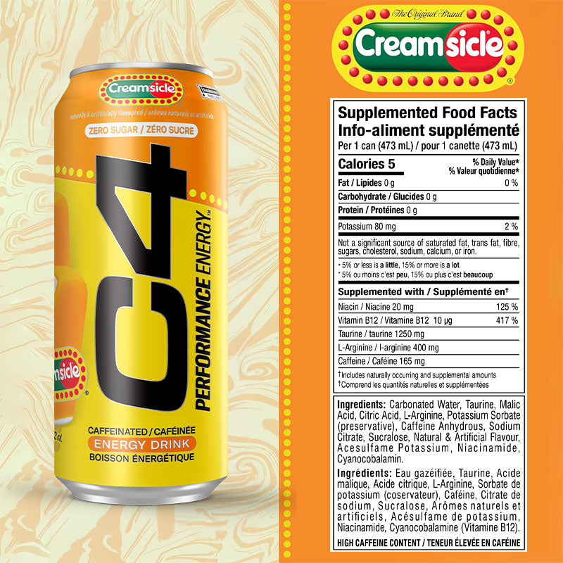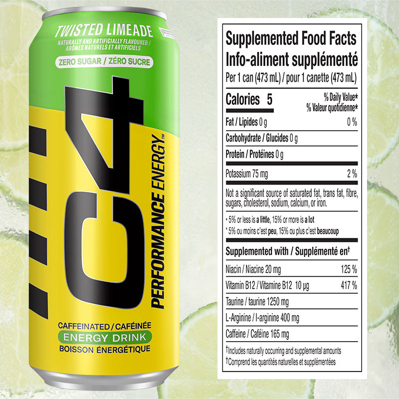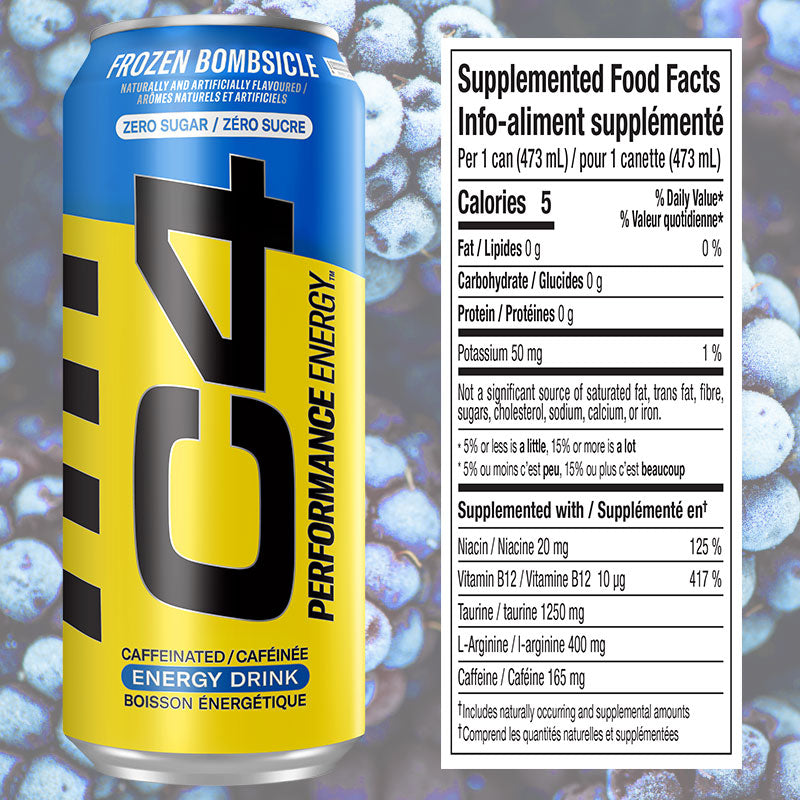 Canned, carbonated, and charged with the explosive energy and flavor of C4, C4 Original carbonated is the perfect explosive energy drink for your demanding and active lifestyle. With mouthwatering flavors like Frozen Bombsicle, Twisted Limeade, and Tropical Blast, C4 Original carbonated tastes amazing and contains ZERO sugar, ZERO calories, and ZERO carbs.
