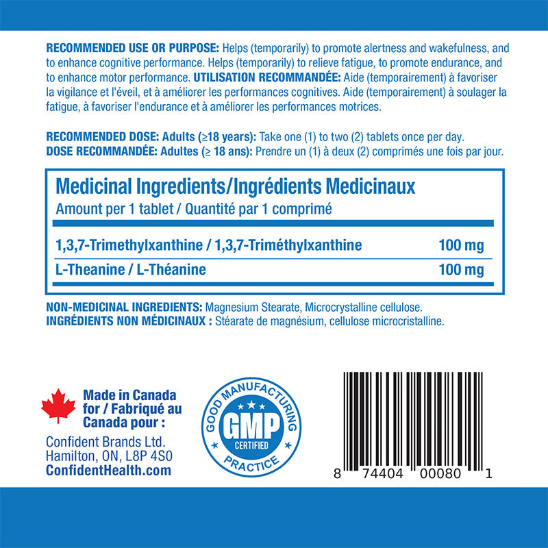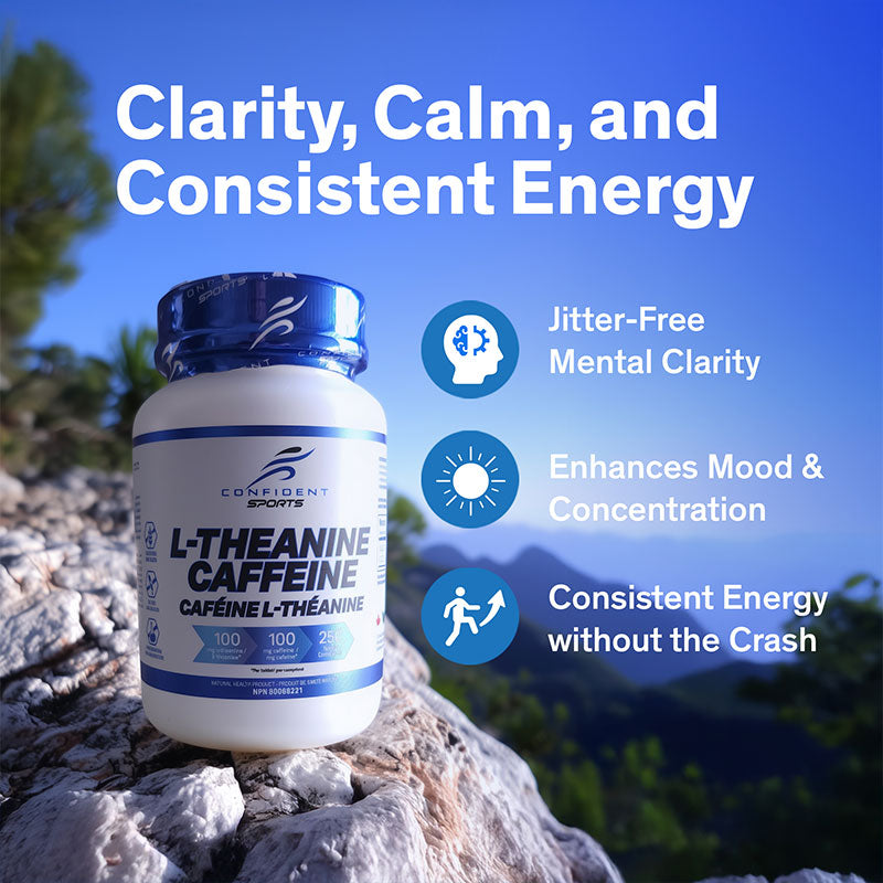 Confident Sports L-Theanine + Caffeine combines two well-researched compounds in a balanced 1:1 ratio. Each tablet provides 100 mg of Caffeine and 100 mg of L-Theanine, designed to support mental alertness and focus without excessive stimulation or the common “jitters” associated with caffeine alone.