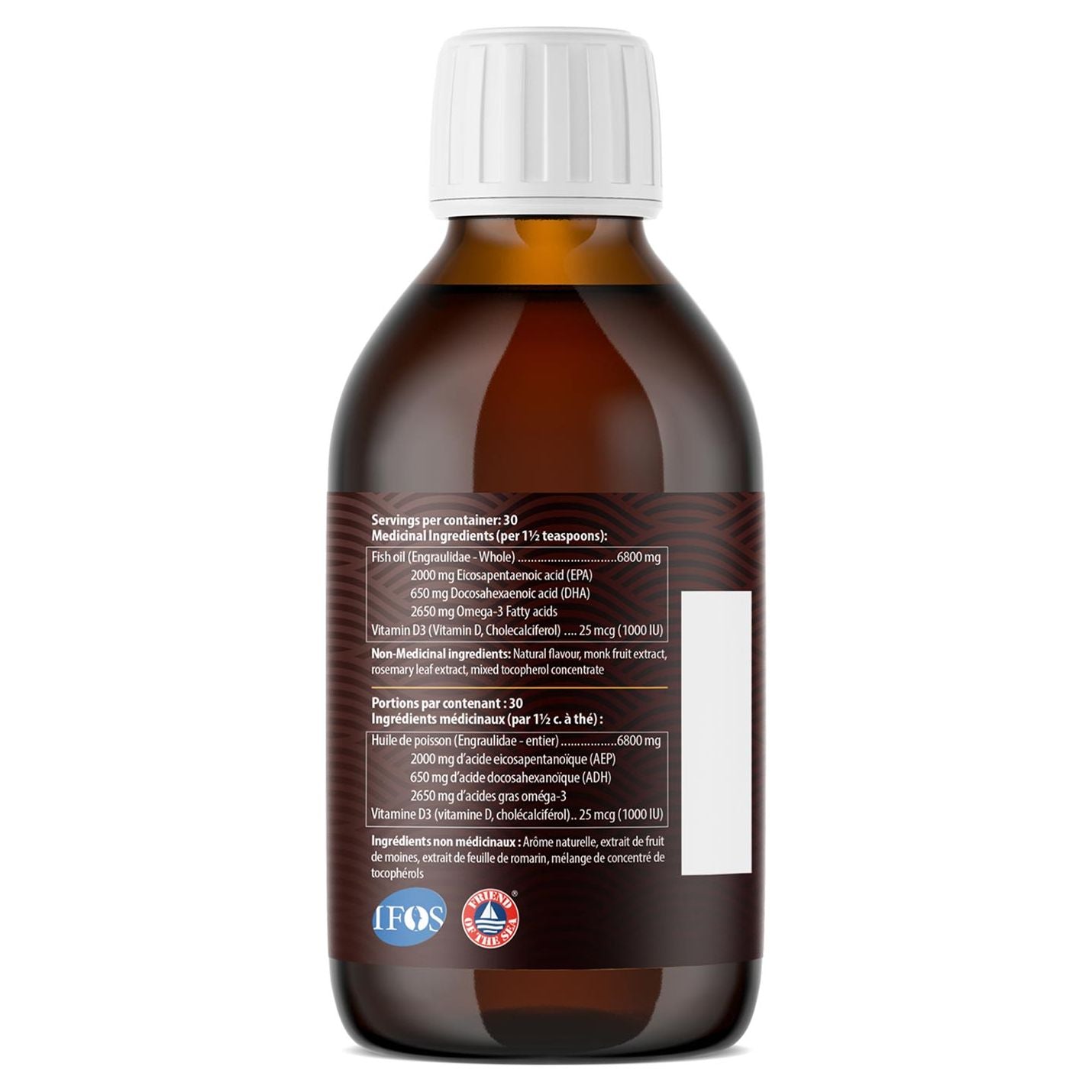 Anchovy Oil, Natural Flavours, Green Tea Extract, Rosemary Extract, Monk Fruit Extract, Mixed Tocopherol Concentrate. Directions : Take 1.5 tsp daily. Shake well before using. Consult your physician if you are taking prescribed blood-thinning agents before consuming. Refrigerate after opening.