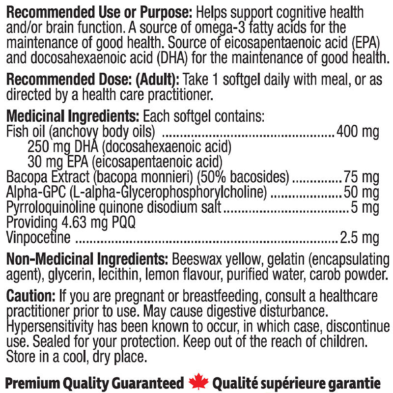 All Neuro-Force™ ingredients are supported by scientific evidence and approved by Health Canada including Docosahexanoic acid (DHA), Vinpocetine, Pyrroloquinoline Quinone (PQQ), Bacopa Monnieri Extract and Alpha GPC (L-alpha-glycerylphosphorylcholine).