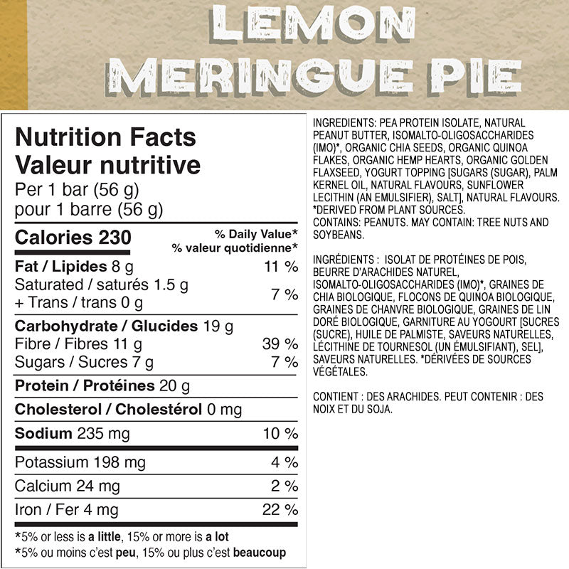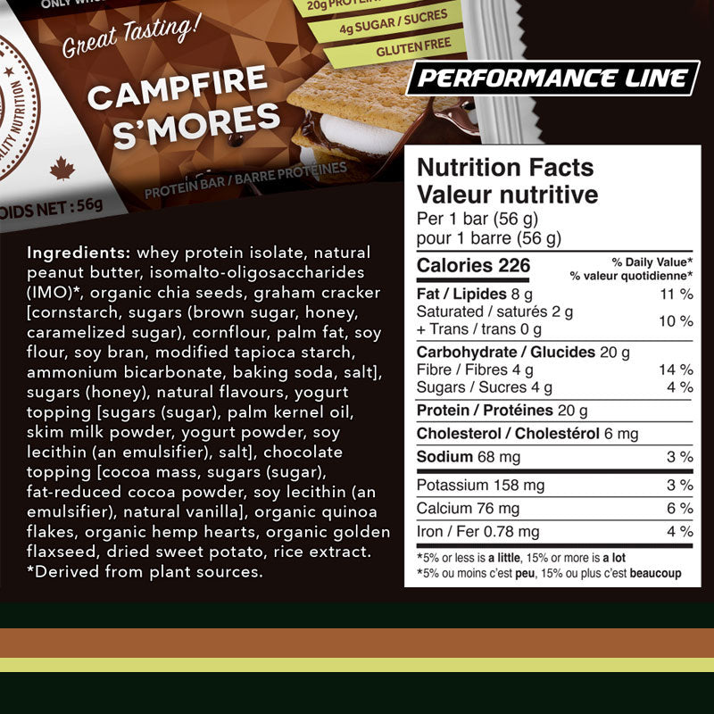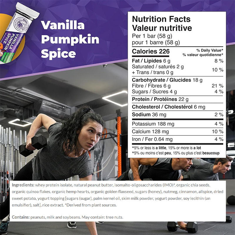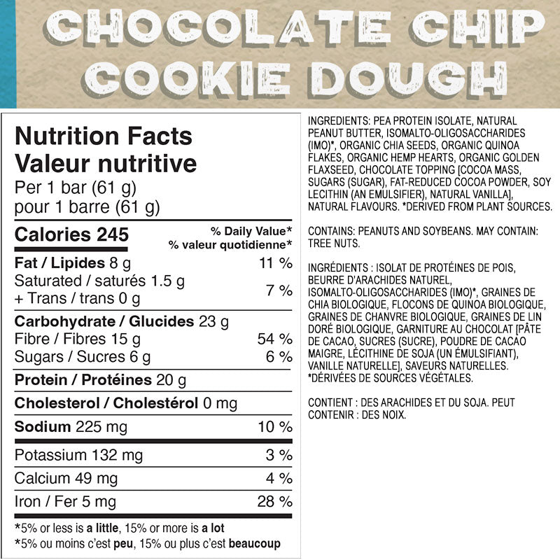 Ingredients: Whey protein isolate, peanut butter, isomalto-oligosaccharides (IMO)*, chia seeds, ground coffee beans, honey, natural vanilla extract, natural yogurt topping (organic cane sugar, non-hydrogenated palm kernel oil, organic skim milk powder, yogurt powder, salt), natural chocolate topping (organic cane sugar, organic cacao, organic cocoa butter, vanilla bean), quinoa flakes, hemp hearts, golden flaxseed, dried sweet potato, rice extract. *Derived from plant sources.