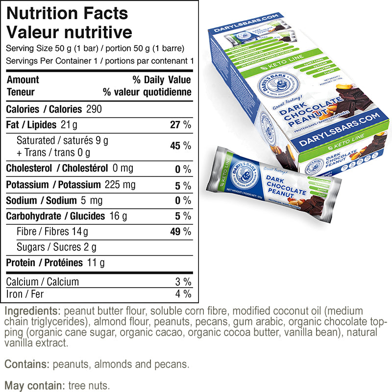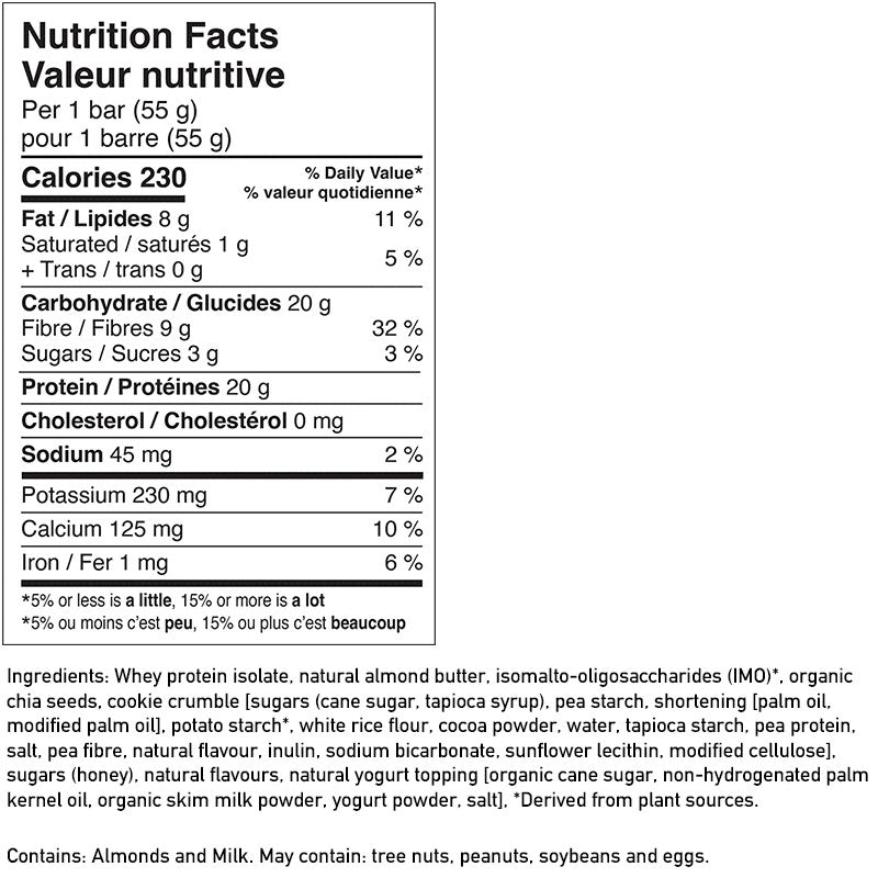 Ingredients: Whey protein isolate, peanut butter, isomalto-oligosaccharides (IMO)*, chia seeds, ground coffee beans, honey, natural vanilla extract, natural yogurt topping (organic cane sugar, non-hydrogenated palm kernel oil, organic skim milk powder, yogurt powder, salt), natural chocolate topping (organic cane sugar, organic cacao, organic cocoa butter, vanilla bean), quinoa flakes, hemp hearts, golden flaxseed, dried sweet potato, rice extract. *Derived from plant sources.
