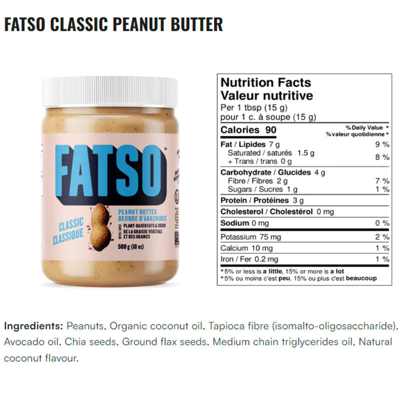 Fatso is an all-natural, high-performance peanut butter enriched with plant based superfats including coconut oil, avocado oil and MCT oil. Chia and flax provide added nutrition, and the naturally sweet tapioca fiber also acts as a prebiotic without the added sugar, calories or glycemic spikes.
