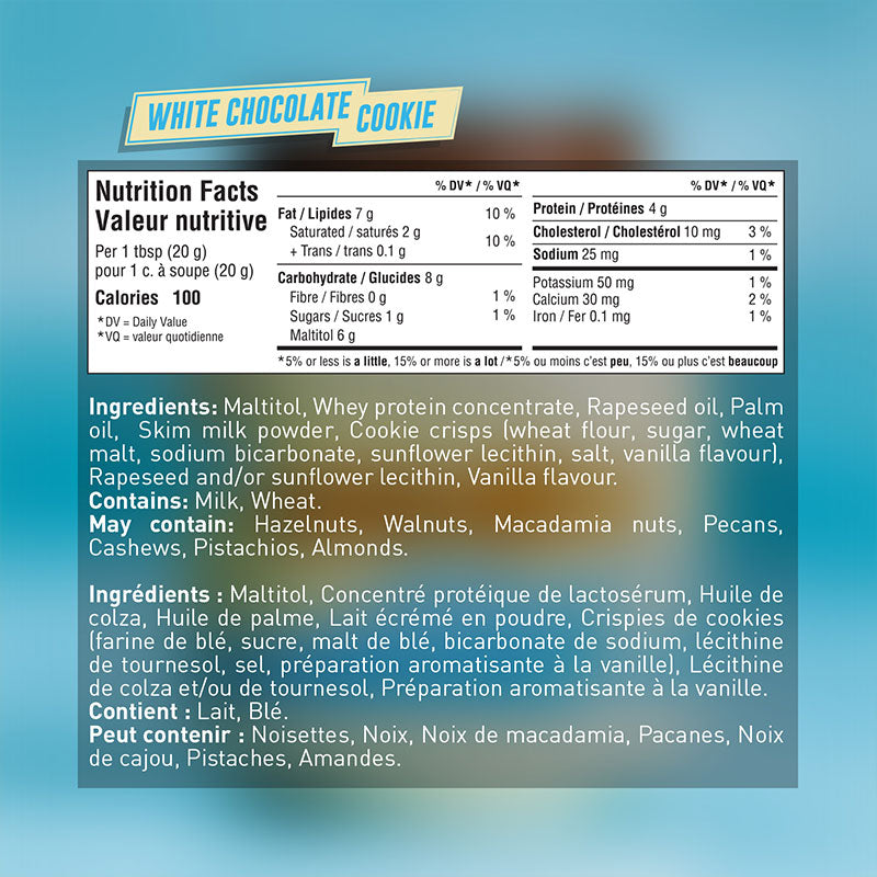 Vegetable Oil (Rapeseed Oil, Sustainable Palm Oil), Sweetener: Maltitol; Whey Protein Concentrate (Milk) (19.5%), Skimmed Milk Powder, Fat Reduced Cocoa (6.5%), Cocoa Nibs (3%), Emulsifier: Sunflower Lecithin; Sea Salt (0.5%), Natural Flavour (Milk), Natural Vanilla Flavouring.