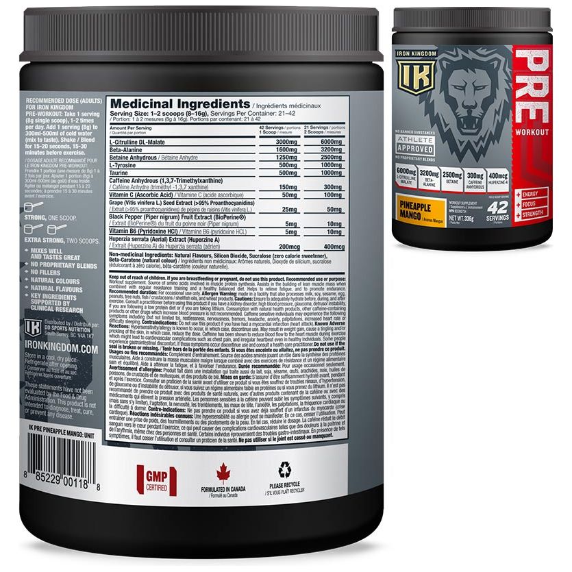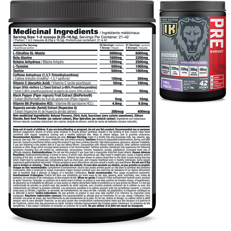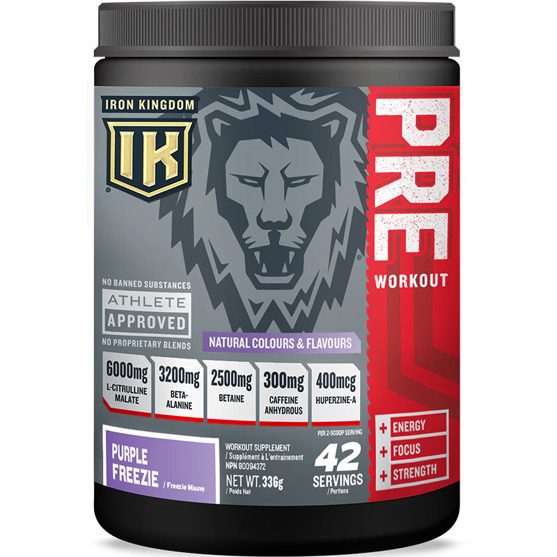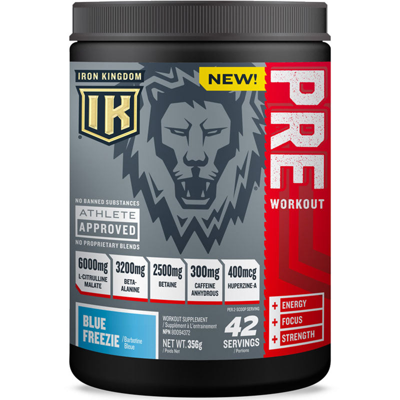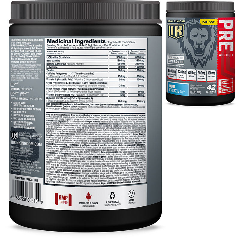 IRON KINGDOM PRE-WORKOUT has key ingredients in clinical doses such as L-Citrulline Malate (6,000mg) Beta-Alanine (3,200mg) and Betaine (2,500mg) that help provide strength, energy and endurance. IRON KINGDOM PRE-WORKOUT is also formulated with Caffeine Anhydrous and Huperzine-A that enhance both energy and focus levels.