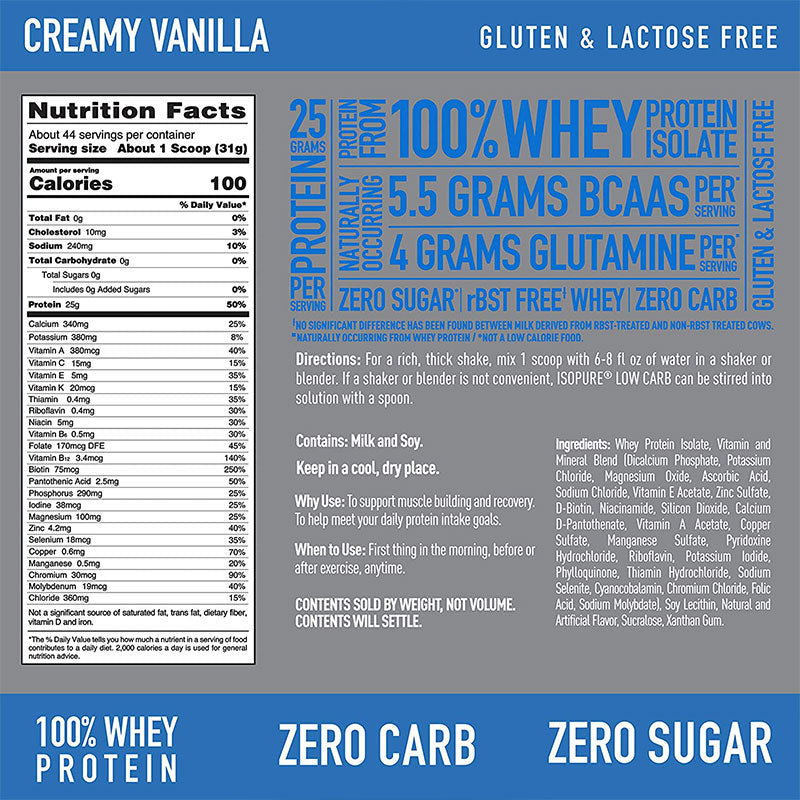 This is premium protein that’s true to its name. ISOPURE® Unflavored Whey Protein Isolate contains 25 grams of 100% pure whey protein isolate per scoop, stripped of fat, carbs, fillers, sugars and lactose. All with no added colors, flavors or sweeteners. It’s perfect for mixing into your favorite flavored beverages (hot or cold), soups, sauces and baked goods recipes.