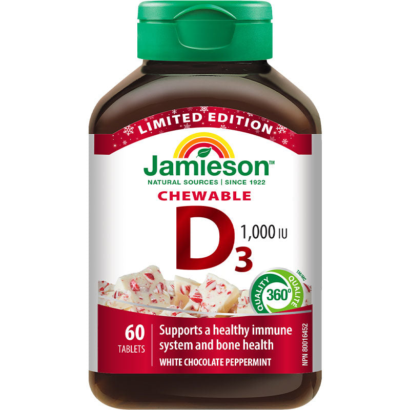 Support your immune system and bone health with Jamieson Vitamin D3 1,000 IU Chewables in a delicious White Chocolate Peppermint flavour, a nostalgic holiday favourite. Each chewable tablet helps your body absorb calcium and phosphorus to support strong bones, teeth, and healthy immune function. Vegetarian and made with no artificial flavours or colours, it's a fun and tasty way to get your daily D3 all winter long.