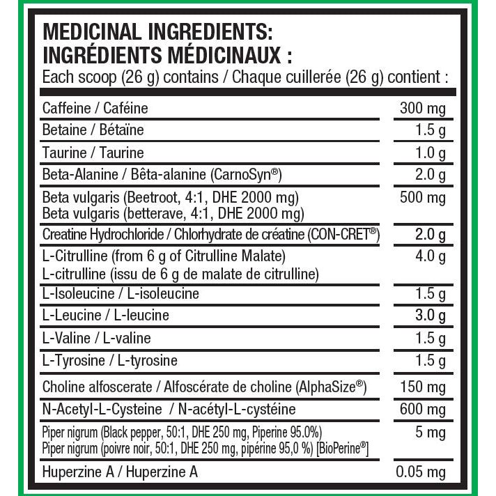 Warnings: DO NOT USE IF YOU ARE UNDER THE AGE OF 18, PREGNANT OR NURSING, HAVE ANY KNOWN OR SUSPECTED MEDICAL CONDITIONS, ARE TAKING ANY PRESCRIPTION OR OVER THE COUNTER MEDICATIONS, OR SENSITIVE TO CAFFEINE. Consult with a qualified healthcare professional before using this or any other dietary supplement. Contains 300mg of caffeine per serving, the equivalent of approximately 3 cups of coffee. DO NOT USE WITH ANY OTHER CAFFEINATED PRODUCT. Too much caffeine may cause nervousness, irritability, sleeplessness and/or rapid heartbeat. Immediately discontinue use and consult your doctor if any adverse reactions occur.