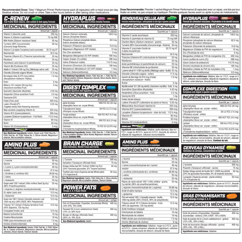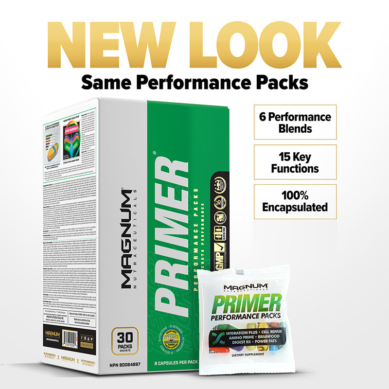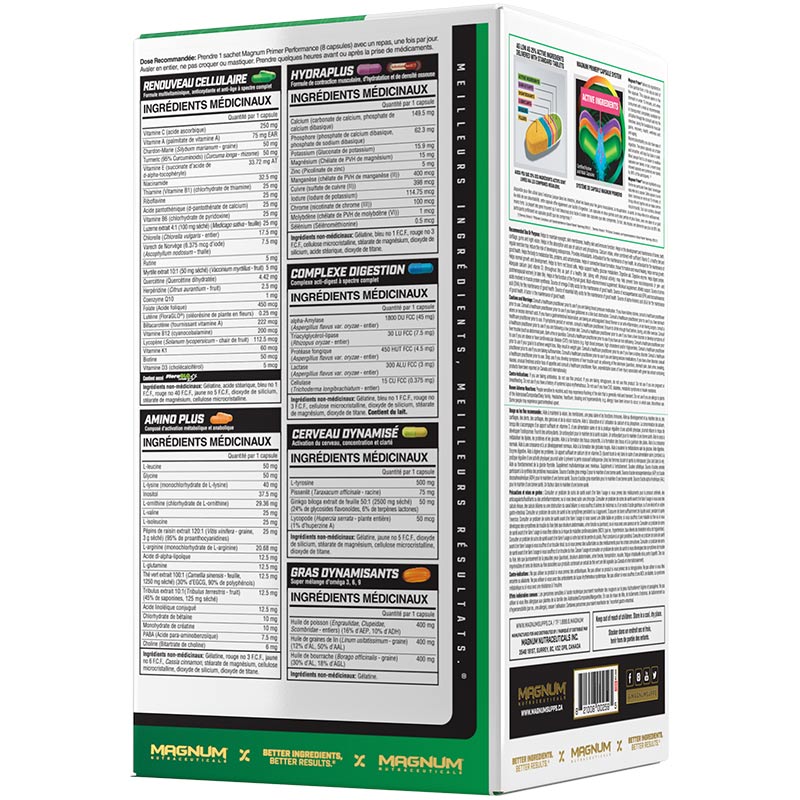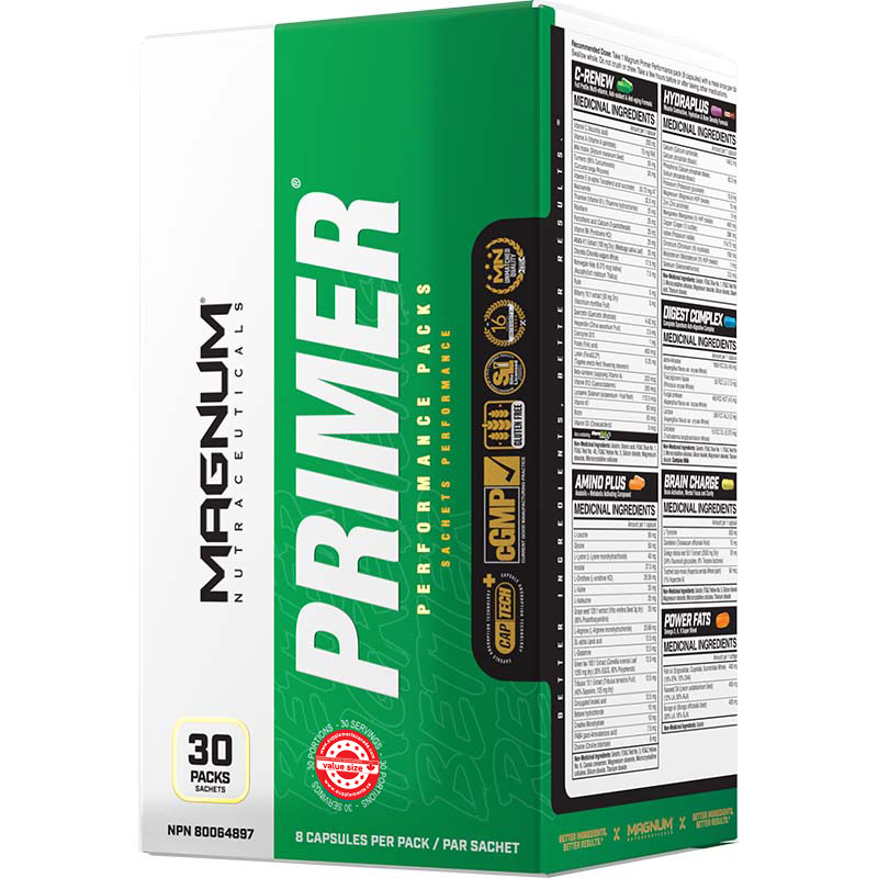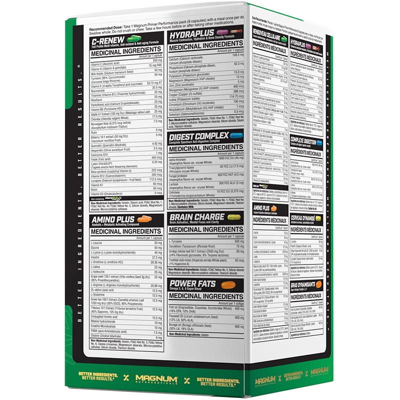 Magnum Primer is a daily vitamin and nutrient performance pack. Primer is formulated to ensure you have the perfect nutrient foundation to maintain and increase the rate by which you can achieve your athletic goals. Without Primer, you won’t build as much muscle, burn as much fat, or train with as much intensity.