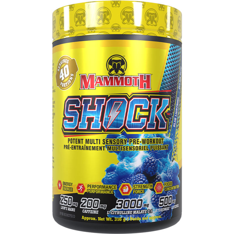 Mammoth SHOCK is the new standard for High Intensity, Maximum Dose Pre-Workouts. Shock’s potent combination of ingredients and clinical dosing makes it the Ultimate Pre-Workout. Mammoth SHOCK is designed to give athletes next-level workouts with Unreal Muscle Pumps; Razor-Sharp Focus, Power & Recovery.