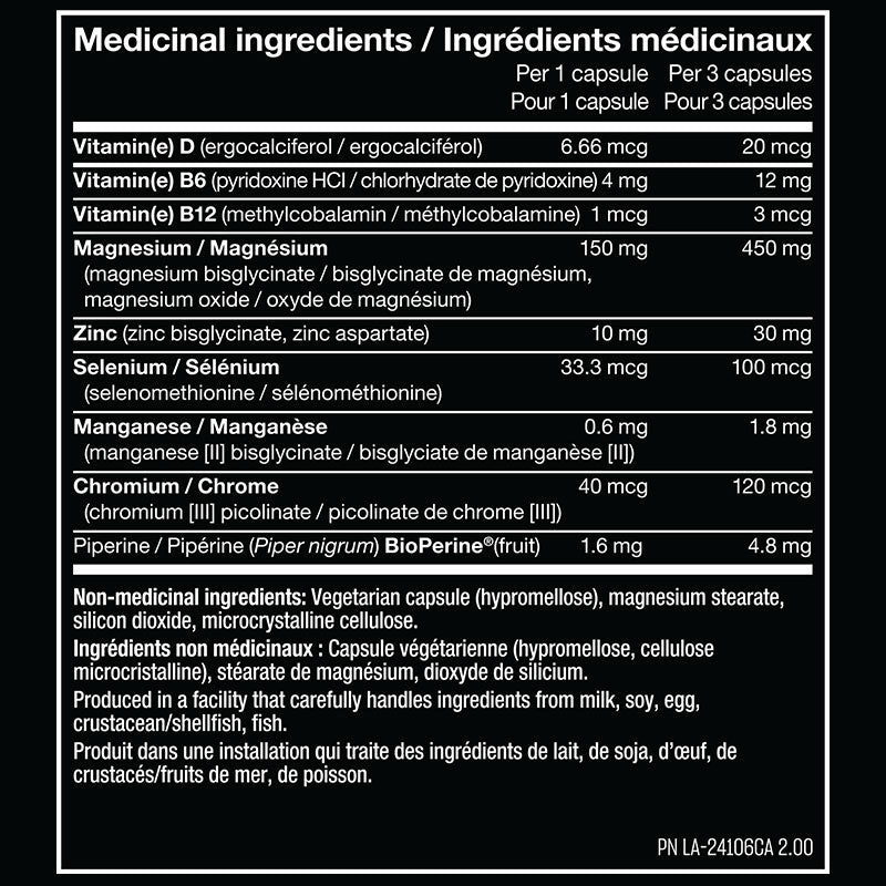 - 100% or more of your daily requirements for vitamins D, B6, B12, magnesium, zinc, selenium, and chromium