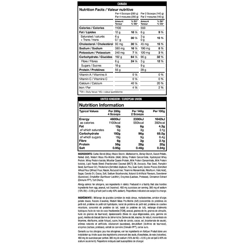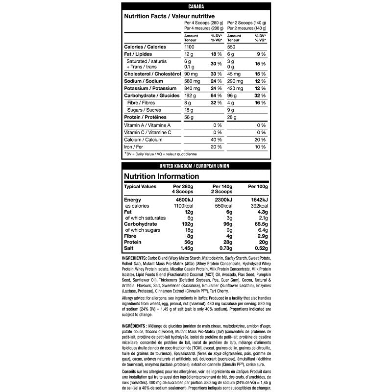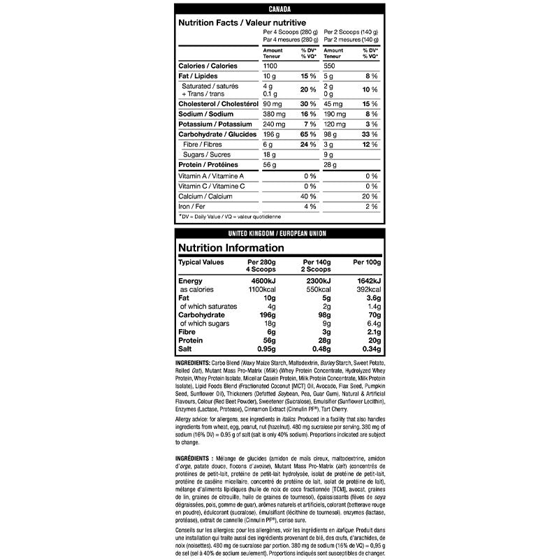 Mutant Mass includes a unique combination of fast-acting and slow-release protein sources. The fast-acting protein sources include, whey protein isolate, whey protein hydrolysate, and three different whey protein concentrates. The slow-release proteins include micellar casein, milk protein concentrate, calcium caseinate, egg white albumin protein, and milk protein isolate.