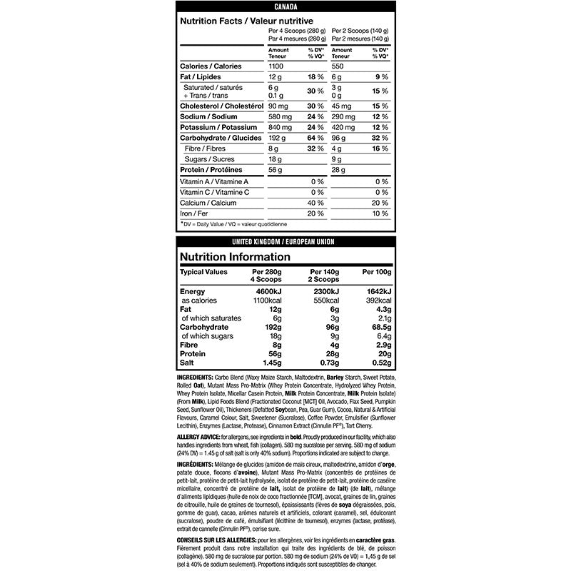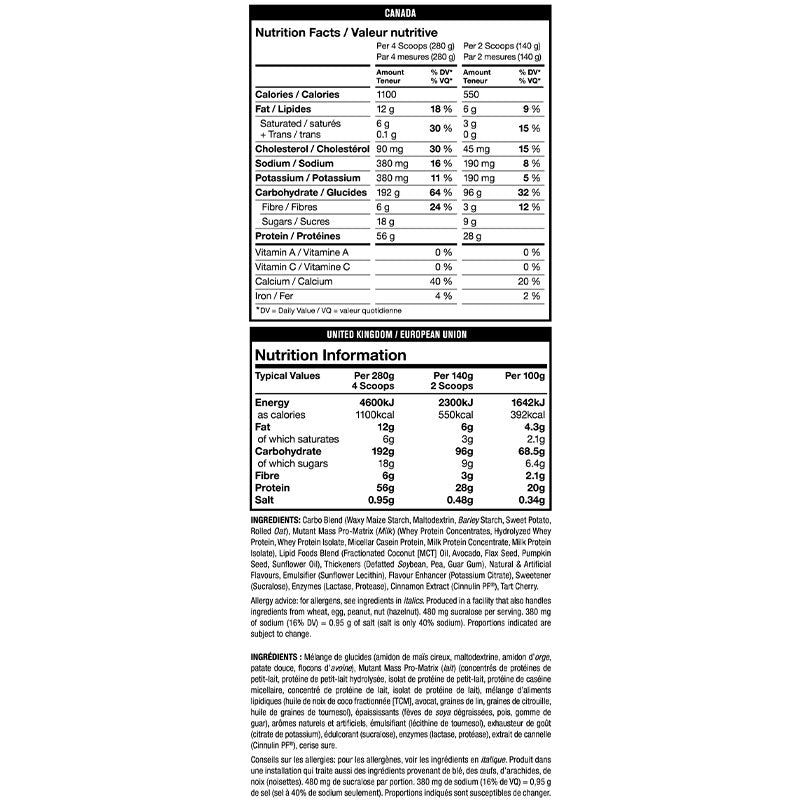 Mutant Mass includes a unique combination of fast-acting and slow-release protein sources. The fast-acting protein sources include, whey protein isolate, whey protein hydrolysate, and three different whey protein concentrates. The slow-release proteins include micellar casein, milk protein concentrate, calcium caseinate, egg white albumin protein, and milk protein isolate.