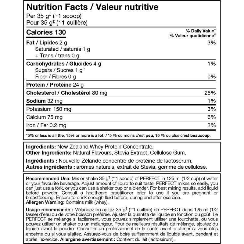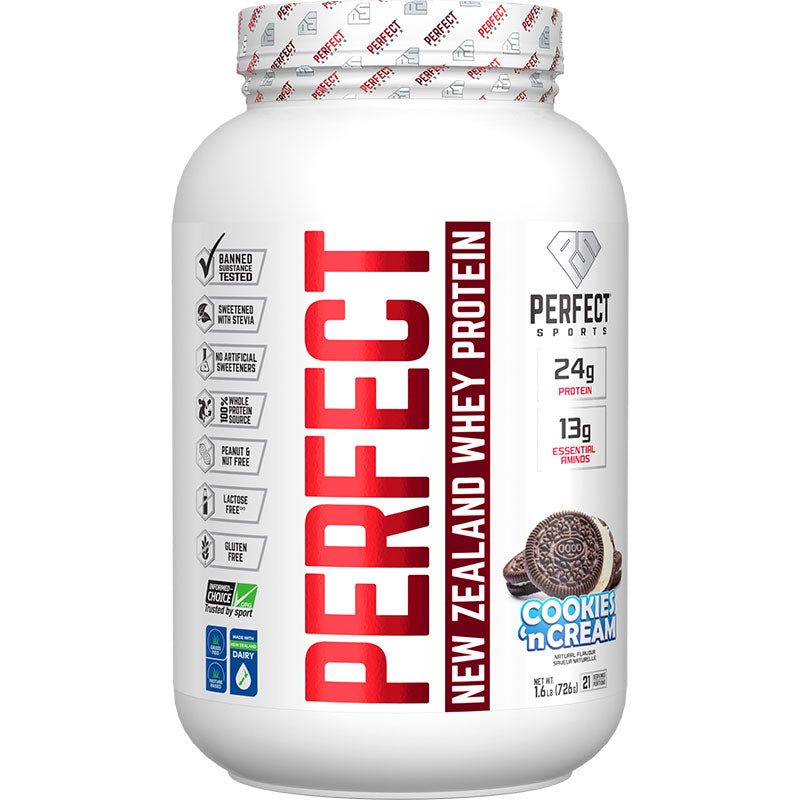 PERFECT contains only New Zealand Whey Protein Concentrate. New Zealand cows spend an average of 90% of their time in the pasture and they get, on average 85% of their Nutrition Plan, from grass, grass silage, hay and forage crops annually. What’s more, their feed is free from pesticides, herbicides, antibiotics and added Development hormones (rBGH or rBST).