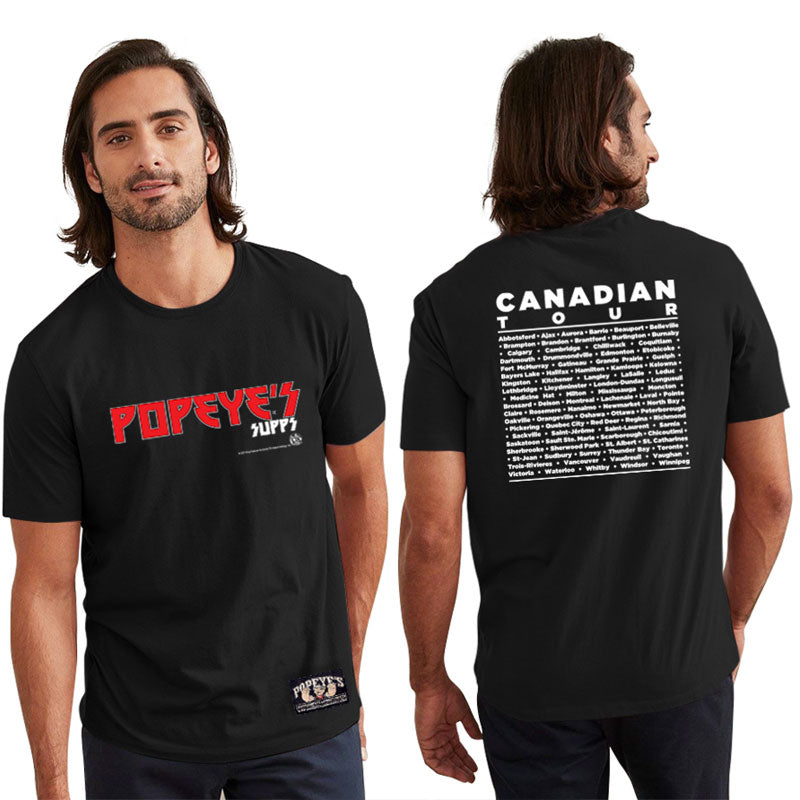 Styled with the Popeye's Concert "Canadian Tour" design on the front chest, and Popeye's Supplements woven patch on the bottom hip. The back of the t-shirt lists all of the cities that there is a Popeye's Supplements retail location.