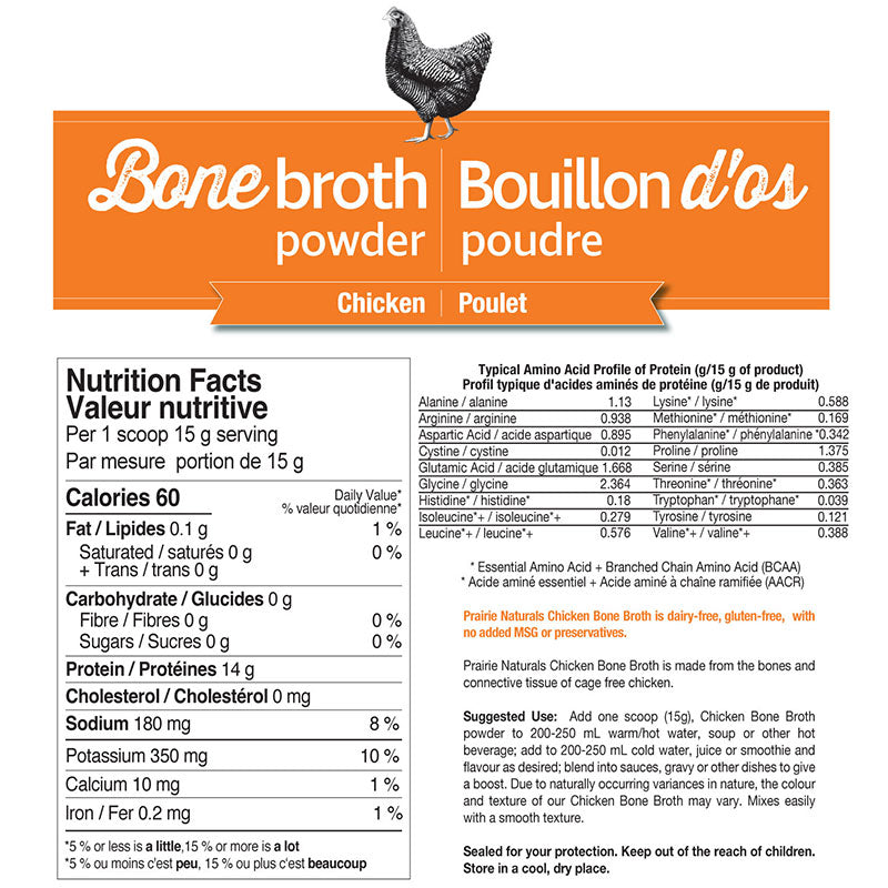 • Prairie Naturals Chicken Bone Broth Powder uses parts of the animal that traditional cultures prized. All the benefits of homemade bone broth in powdered form.