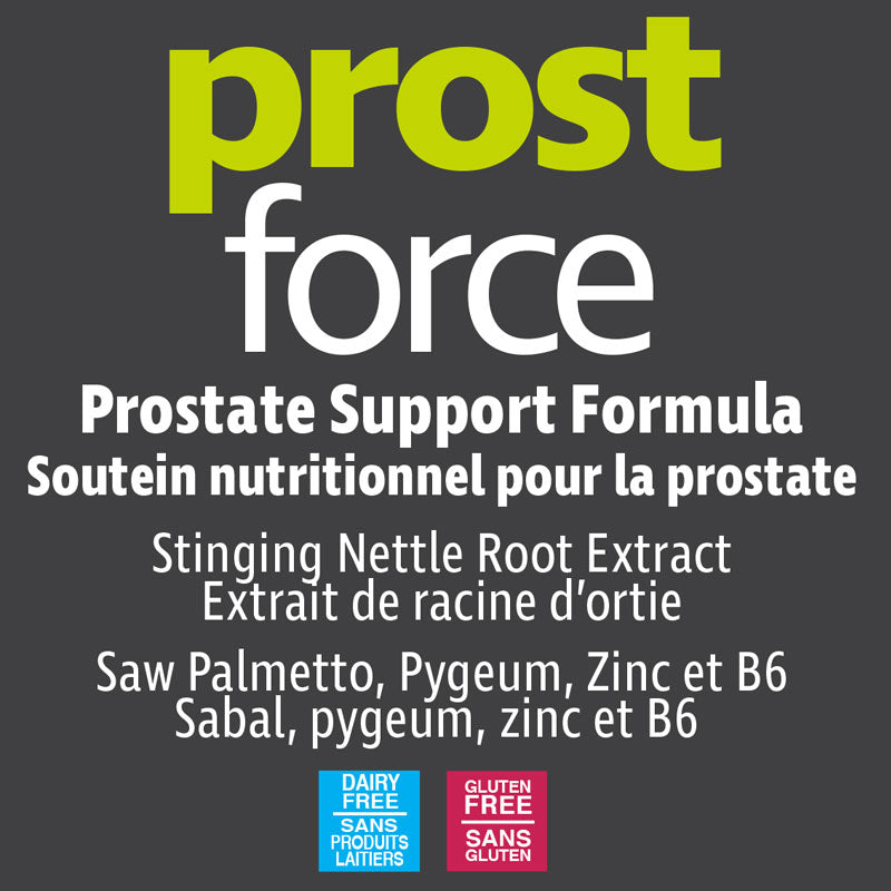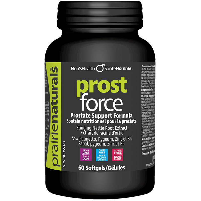 Prairie Naturals Prost Force is an evidence-based formulation that synergistically combines the key nutritional and phytochemical ingredients researchers recommend for prostate health. These include Vitamin B6 and zinc along with potent plant extracts: Saw palmetto, Pygeum bark, lycopene, stinging nettle root and pumpkin seeds. Prairie Naturals Prost Force provides prostate protection naturally.
