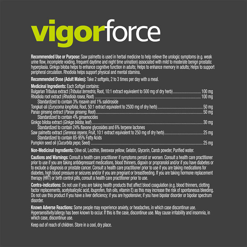 Prairie Naturals’ best-selling for Men is better than ever! Re-formulated and improved by award-winning Naturopathic Doctor, Jonathan Beatty, the new Vigor Force is now in soft gel capsules providing an improved delivery system within an enhanced nutrient base. Now with more “Sexy Time” ingredients – Eurycoma longifolia jack (Tongkat Ali) Rhodiola rosa, Tribulus terrestris, Panax ginseng, Ginkgo biloba, Saw palmetto and Pumpkin seed oil, Vigor Force gives men just the right kind of energy lift.