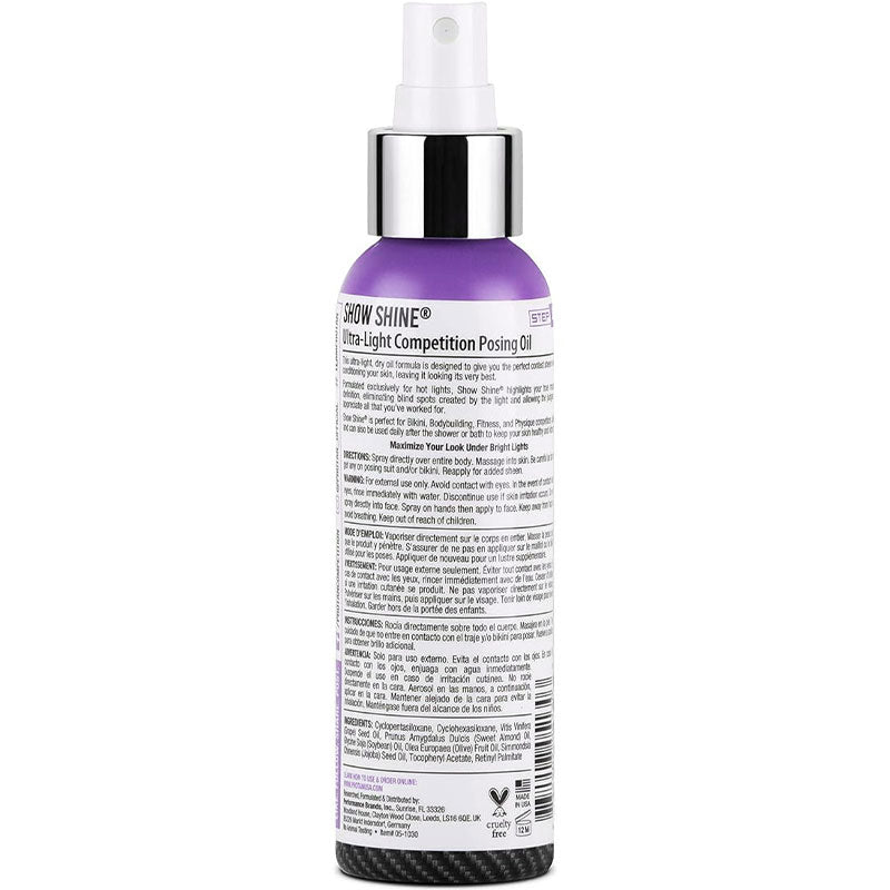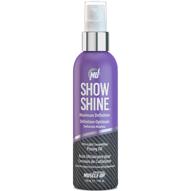 Formulated exclusively for hot lights, Show Shine® highlights your true muscle definition, eliminating blind spots created by the light and allowing the judges to appreciate all that you’ve worked for.