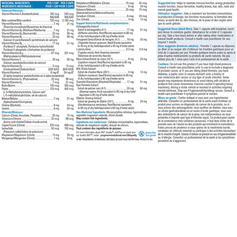 Progressive 100% Complete MultiVitamin for Active Men is designed for men on the go. Whether you exercise regularly, work long hours, raise a family or any combination of the above, your body needs the support of an Active MultiVitamin formula.