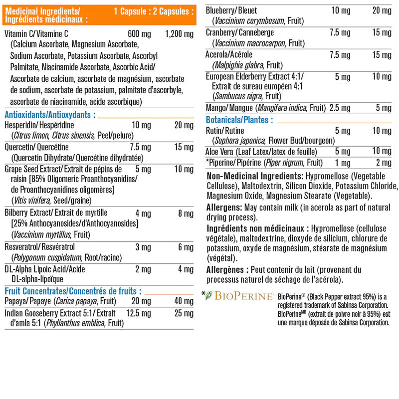 - With whole food sources of vitamin C and antioxidants: Bilberry, Quercetin, Aloe, Resveratrol & Grape Seed