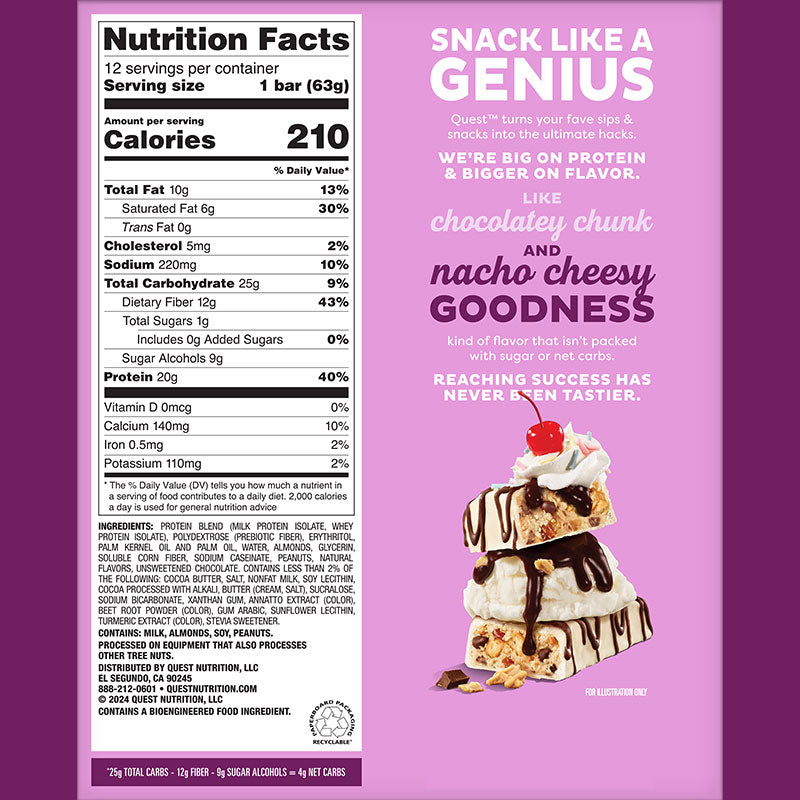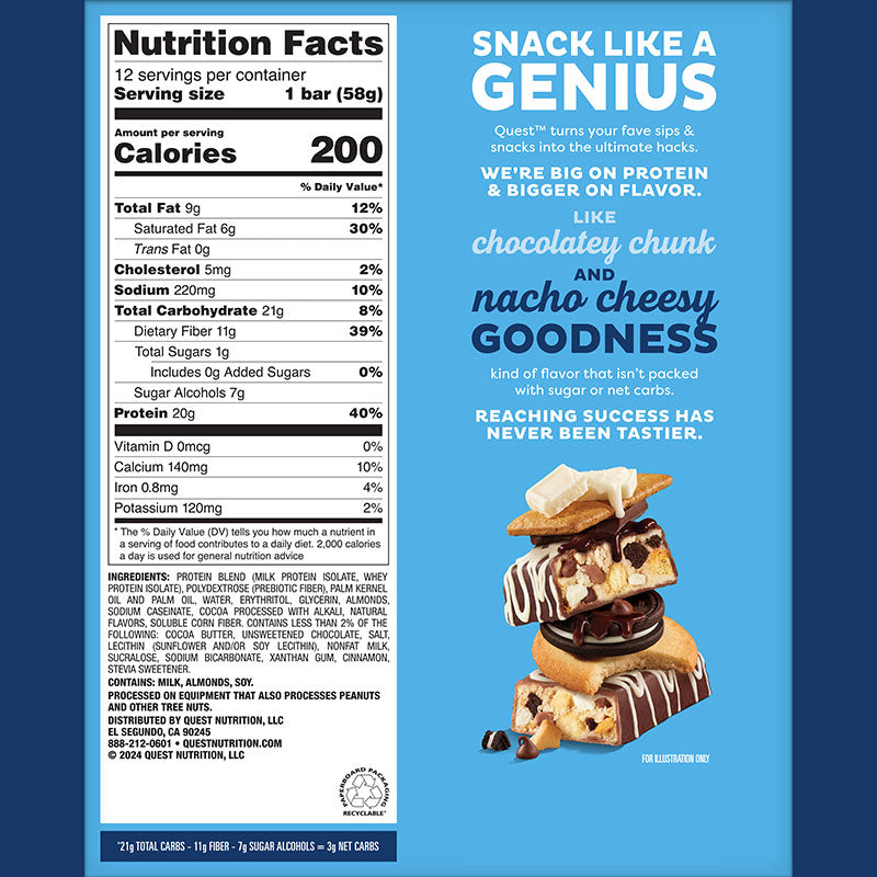 Cheat on basic snacks with protein hacks. New Quest™ Overload Protein Bars are dipped, delightfully drizzled, and packed with more of the chunks, chips & pieces you love – while dialing down the sugar.