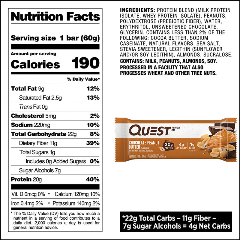 QuestBars are the perfect nutrition bar for anyone looking to get top quality protein while dropping some carbs from their diet. They're as delicious and convenient as a candy bar, while maintaining all of the nutrition of a carefully prepared meal that's packed with fiber to make you feel full and to help with digestion and weight loss.