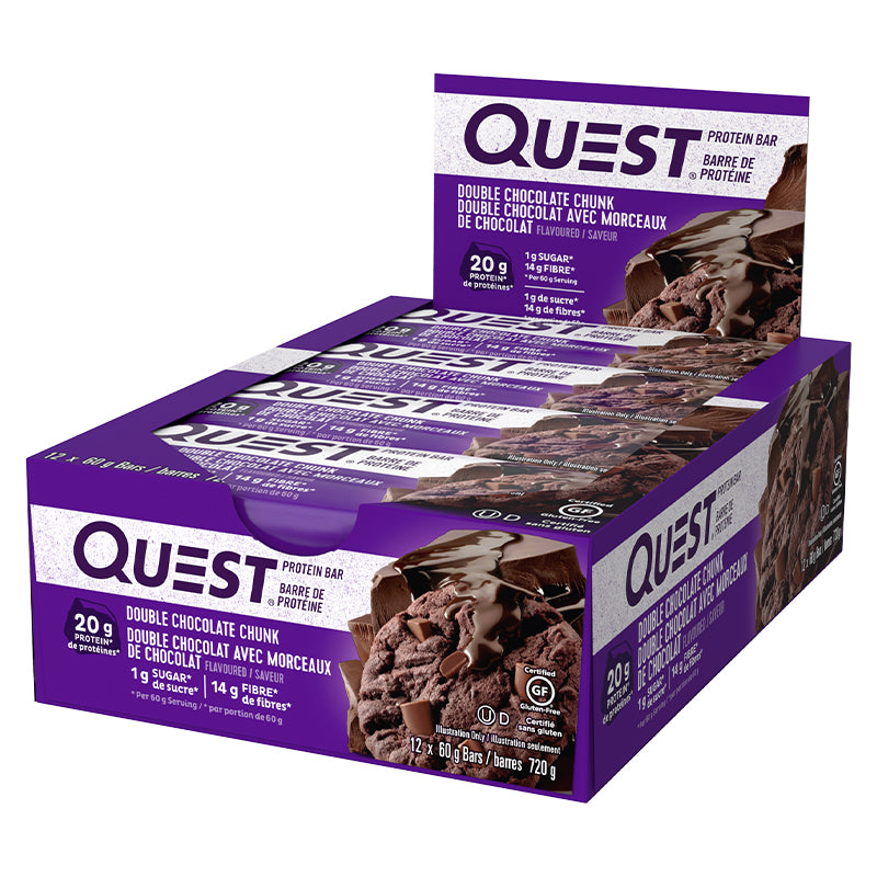 Satisfy your chocolate cravings with the delectable Quest Double Chocolate Chunk Protein Bar.