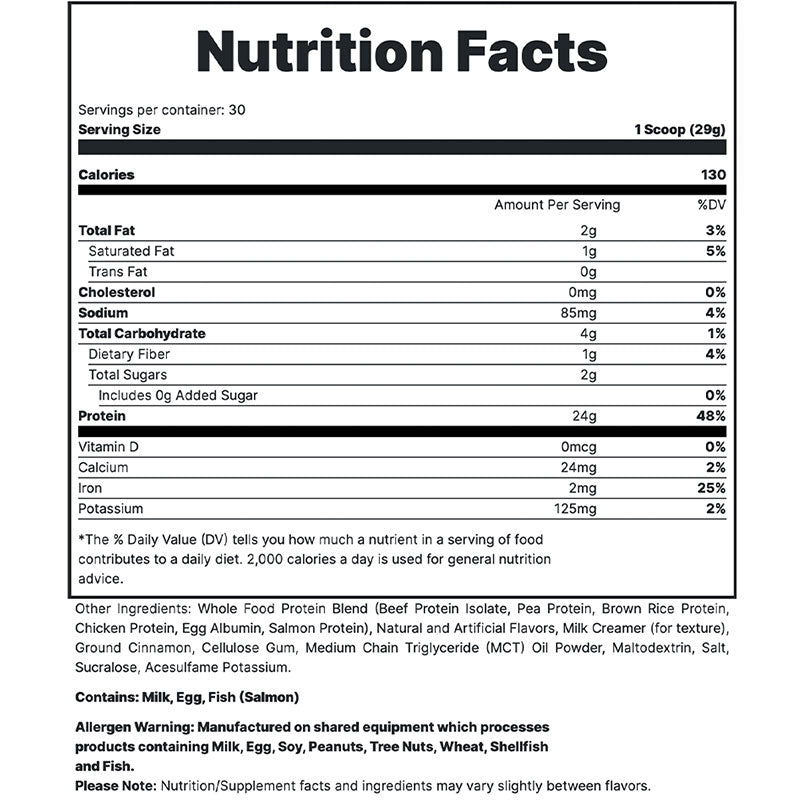 You’ll get beef, salmon, egg, and chicken protein. Plus, the healthy benefits of brown rice protein, pea protein, and MCT oil. Each serving is just 134 calories with 24g of protein and just 2g of sugar. No Whey Protein Just 2g of Sugar per serving Mixes easily without a blender Keto-friendly Allergen Contains: Milk, Eggs, Fish (Salmon), Coconut Warning: manufactured on shared equipment which processes products containing milk, egg, soybean, wheat, shellfish, fish, tree nut flavor and peanut flavor