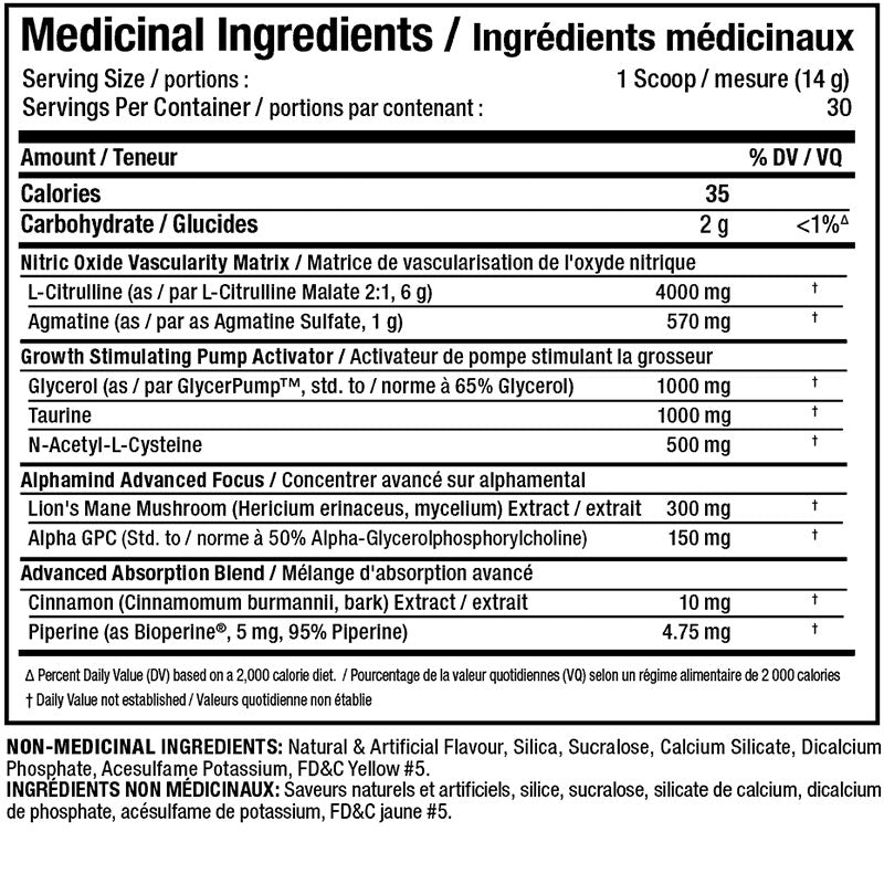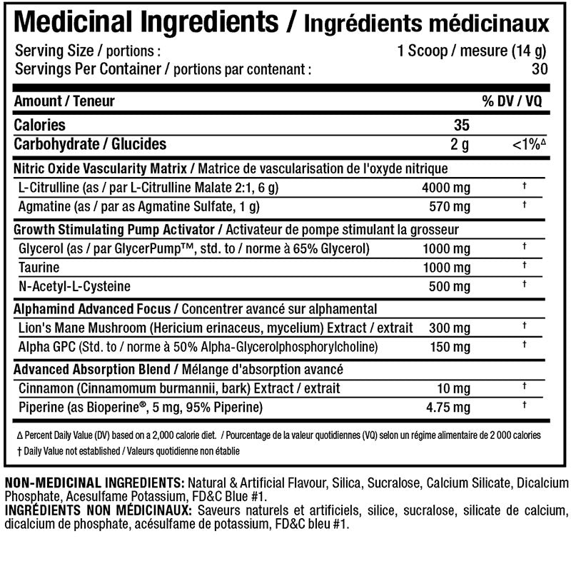 A combination of Citrulline Malate (2:1), Agmatine Sulfate, Glycerpump, N-Acetyl-L-Cysteine (NAC) and Taurine have been included at high levels to take full advantage of their ability to increase the body’s physiological tendency to flood muscles with blood, nutrients, oxygen and yes, metabolic waste products in response to intense training.