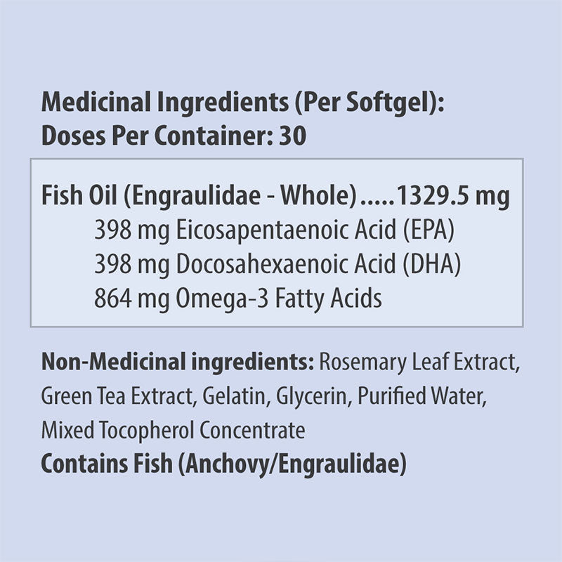 | 398 mg Eicosapentaenoic Acid (EPA) 398 mg Docosahexaenoic Acid (DHA) 864 mg Omega-3 Fatty Acids |