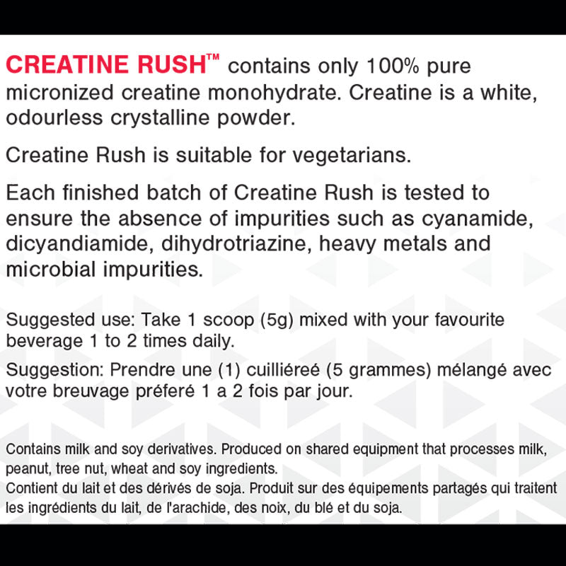 The 100% pure micronized creatine monohydrate present in Creatine Rush is synthesized via a chemical reaction using non animal-based starting materials and is therefore suitable for vegetarians.