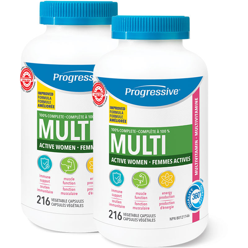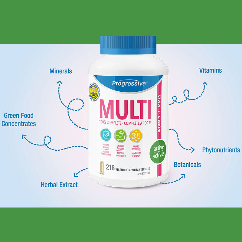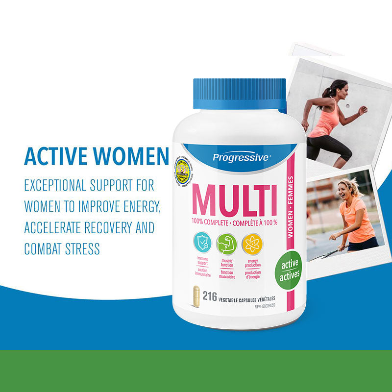 Progressive 100% Complete MultiVitamin for Active Women is designed for women on the go. Whether you exercise regularly, work long hours, raise a family or any combination of the above, your body needs the support of an Active MultiVitamin formula.