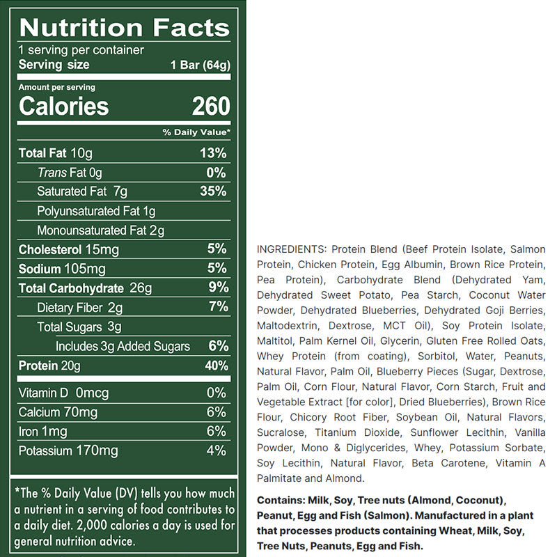 Beef protein blend, salmon protein, chicken protein, egg protein, brown rice protein and pea protein